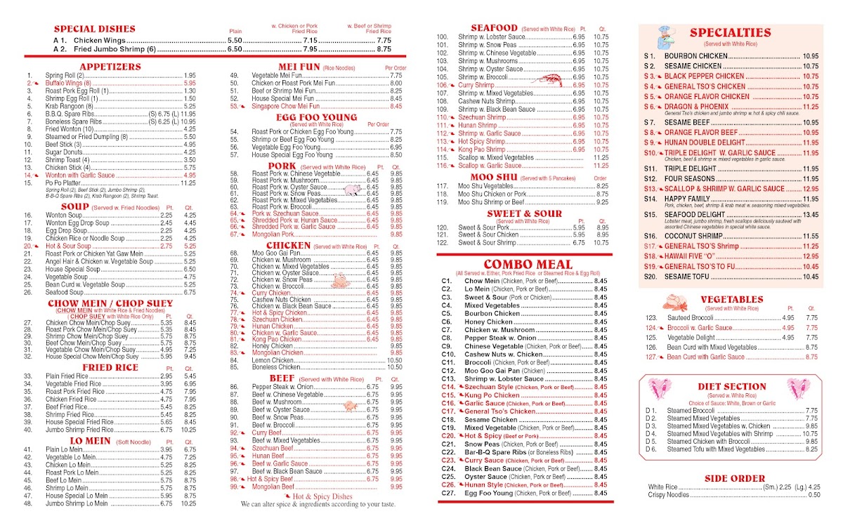 Seafood lovers will delight in selections like Kung Pao Shrimp and Scallops with Mixed Vegetables. The diet-friendly menu features steamed dishes such as Steamed Tofu with Broccoli and Mixed Vegetables perfect for health-conscious diners.
